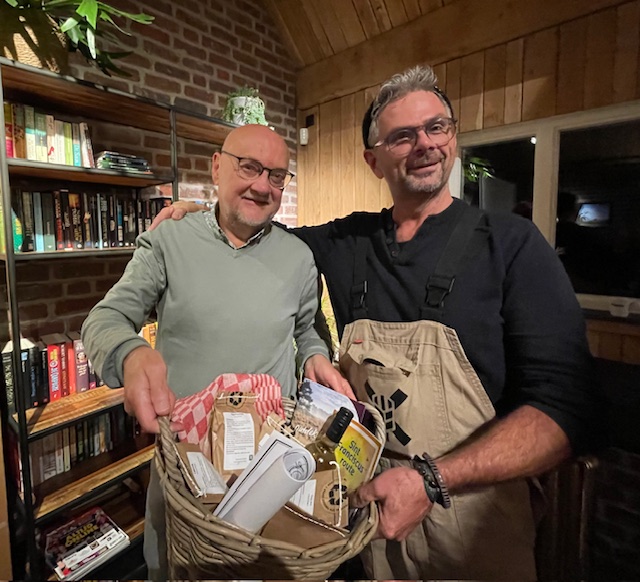Als dank voor zijn interessante presentatie heeft Peter Jansen uit naam van de molenstichting John bedankt met een leuke mand vol molenproducten.